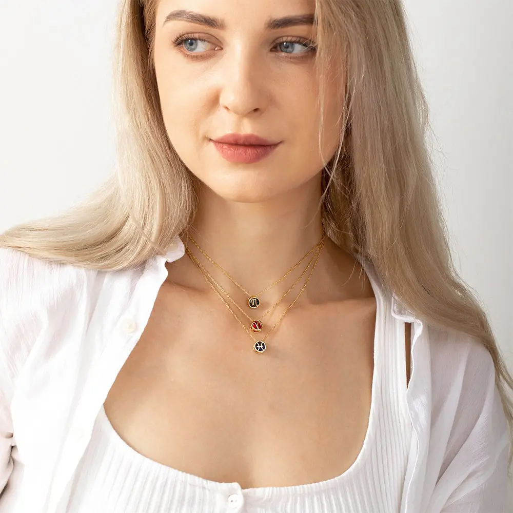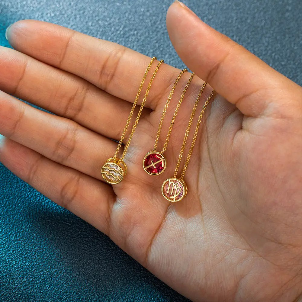 Naszyjnik z kamieniem szlachetnym i znakiem zodiaku – szczególną cechą tego naszyjnika jest to, że możesz mieć w nim zarówno kamień szlachetny, jak i znak zodiaku. Naszyjnik ozdobiony jest pięknym kamieniem szlachetnym i zawieszką zodiakalną, odzwierciedlającą miesiąc urodzenia, znak zodiaku i osobowość osoby noszącej. Będzie on stanowić przemyślany i osobisty prezent.